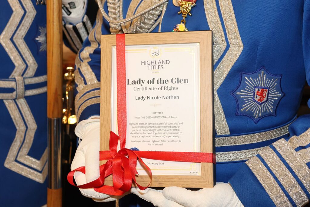 So wurde Nicole am Samstag (24.1.) beim Wagen-Richtfest damit überrascht, dass ihr ein Stückchen Land (ein Square Foot) in den schottischen Highlands übertragen wurde – verbunden damit, darf sie den Titel „Lady Nicole Nothen“ tragen. Für Prinz Marcus gab es einen in dem Naturschutzgebiet in Schottland gepflanzten Baum.