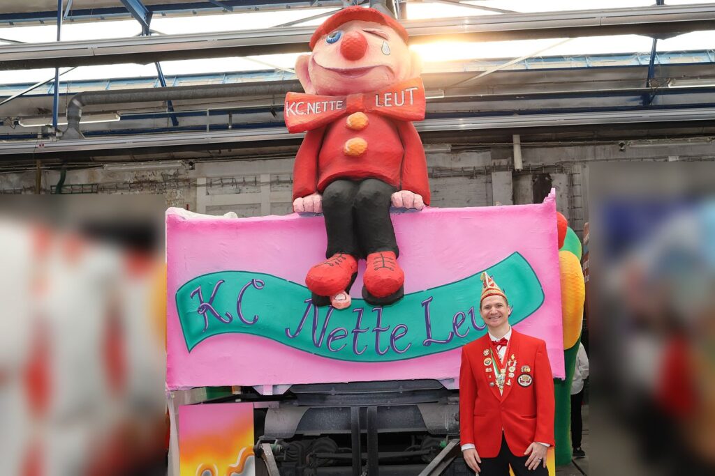 Das Markenzeichen der K.C. Nette Leut ist die Figur mit dem lachenden und dem weinenden Auge, hier auf dem Rosenmontagswagen mit Kevin Kunert- Ingwer