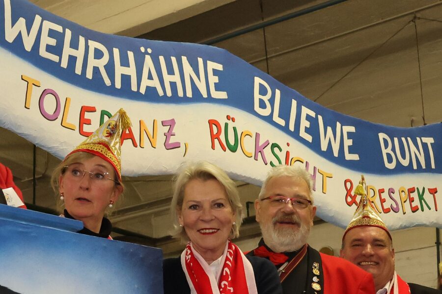 Eine eigene Sitzung organisieren die Närrischen Wehrhähne in dieser Session nicht, aber im Casino der Wagenbauhalle wurde am Freitag (23.1.) mit vielen Gästen, Musik und auch Ehrungen der fertige Rosenmontagswagen gefeiert. Der Name des Vereins geht übrigens auf den Gründungsort zurück. Denn 1972 war es die Gaststätte „Zum Franz“ an der Gerresheimer Straße, in der sich die Gründer trafen. Bei der Namenssuche verleitete dann die Nähe zum Wehrhahn zur Idee und die „Närrischen Wehrhähne“ waren geboren.