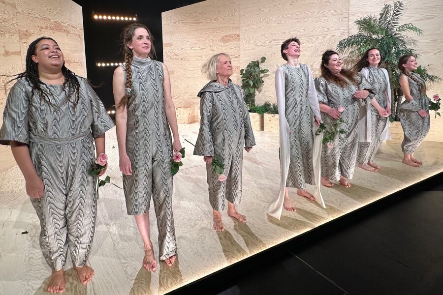Theatermacherin Katharina Bill nutzt gerade mal die Ausgangssituation des Dramas für ihr eigenes Ding. Mit Frechheit und Humor. Sie lässt die gemischte Frauentruppe – sieben temperamentvolle Amateurinnen zwischen 17 und 71 Jahren – von heutigen Gefühlen und Phänomen reden, quasseln, singen, manchmal auch kreischen. Denn die Autorin und Regisseurin ist nicht so für die leisen Töne. Ihre Leitfiguren, verrät sie im Programmheft, „waren immer laute Frauen“. Dabei agiert die Gruppe nicht im nervigen Durcheinander, sondern mit Präzision, wie ein Chor aus Solistinnen.