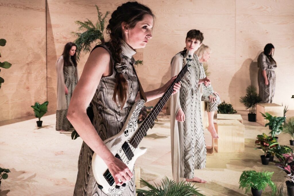Lässt den E-Bass dröhnen: Charlott Lindecken (dahinter: Carl Brüggemann) in den “Drei Schwestern” des Stadt:Kollektivs. Foto: Melanie Zanin / Düsseldorfer Schauspielhaus