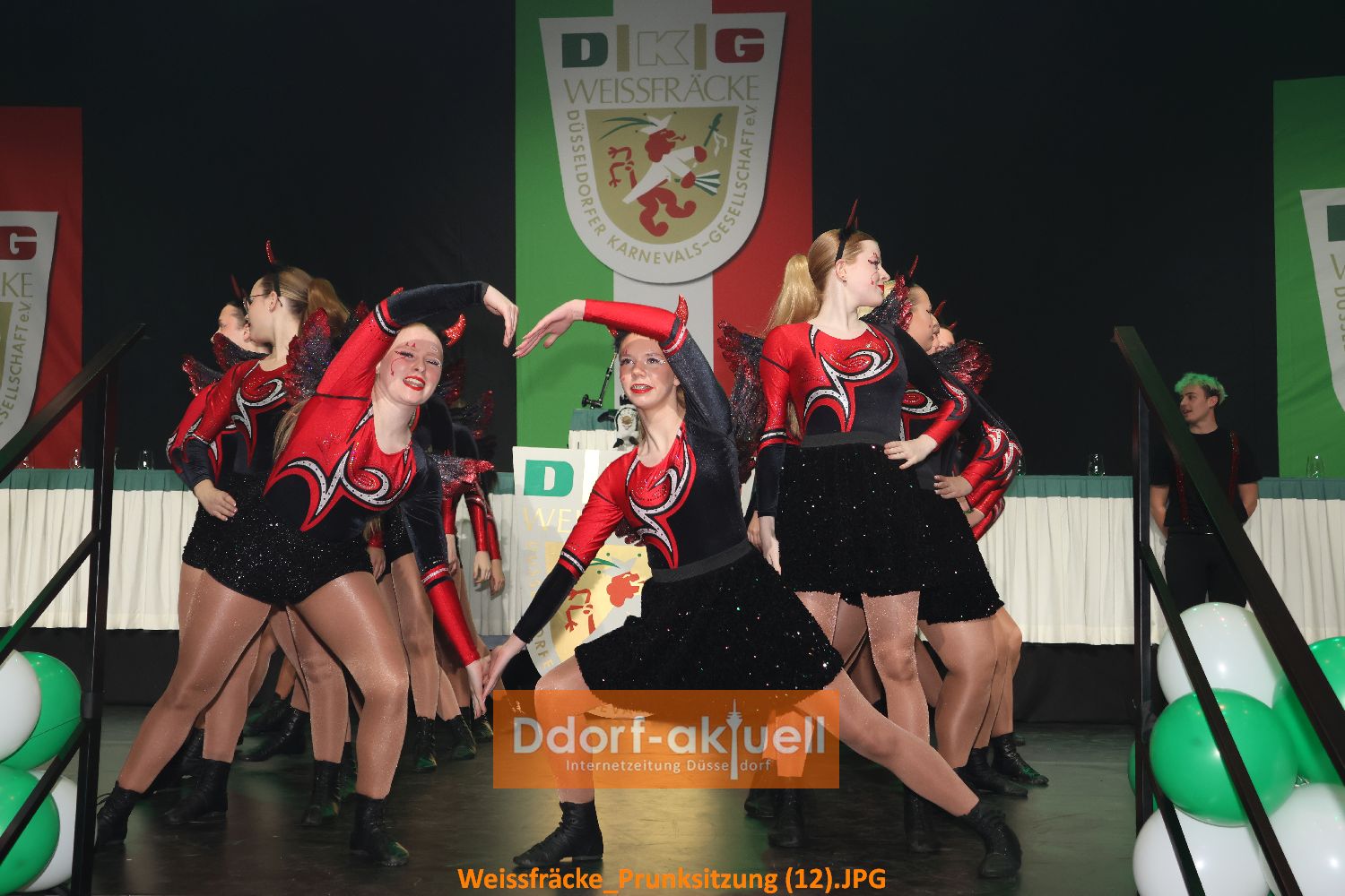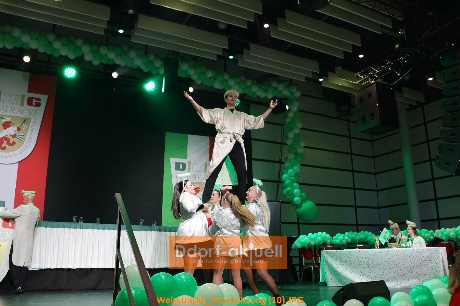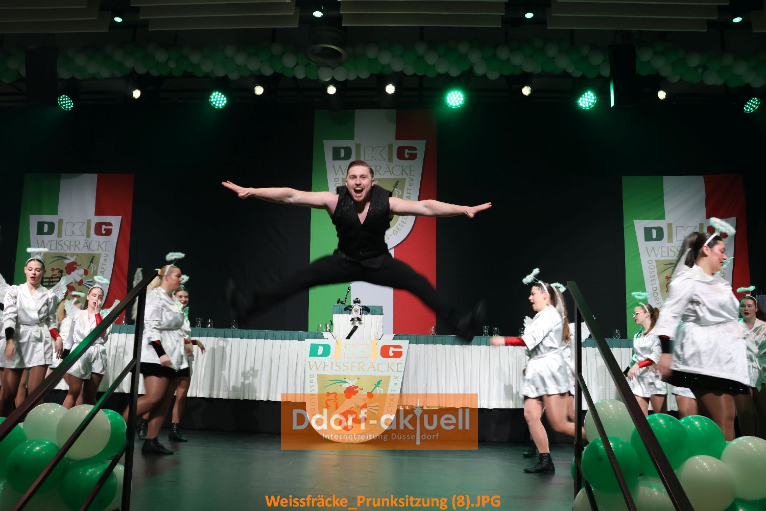 Die Prunksitzung bestand aber nicht nur aus Vorträgen. Gleich zum Auftakt präsentierte die Tanzgarde der Düsseldorfer Originale ihre grandiosen Showtanz und wurde nicht ohne Zugabe von der Bühne gelassen. Das Düsseldorfer Prinzenpaar Prinz Marcus I. und Venetia Nicole zogen mit Garde ein, aber einige schauten irritiert auf die Farbe. Denn es war die Große Rheydter Prinzengarde und das Bundesschützen Tambourcorps Neuwerk, die die Tollitäten begleiteten. Nach dem obligatorischen Sekt für Prinzenpaar und Adjutantur und dem Sessionslied des Prinzenpaars, begeisterten die Rheydter Garde Girls mit ihrem Showtanz.