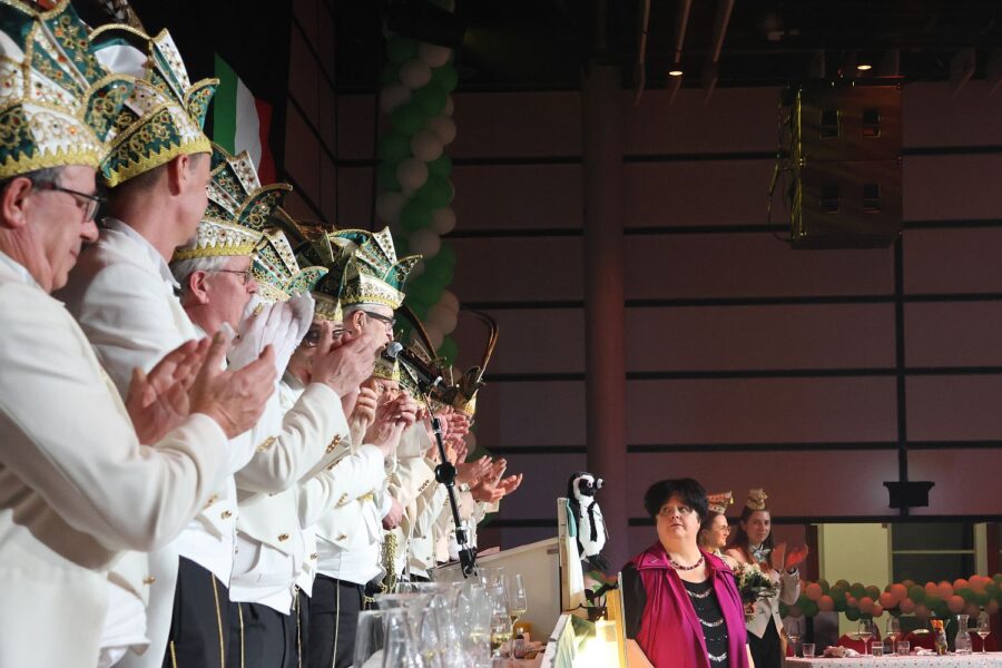 Die DKG Weissfräcke stehen zum Lackschuhkarneval und so waren die bunt verkleideten Gäste bei der Prunksitzung in den Rheinterrassen eher die Ausnahme. Wer aber denkt, Lackschuhkarneval und ausgelassene Stimmung passen nicht zueinander, der wurde am Samstagabend (31.1.) eines Besseren belehrt. Egal ob Redner*in, Band oder Tanzgarde – alle wurden begeistert gefeiert und das größte Lob gab es von Ingrid Kühne: „Wenn alle Gäste so wären wie ihr, dann würde ich auch weiter im Karneval auftreten“.