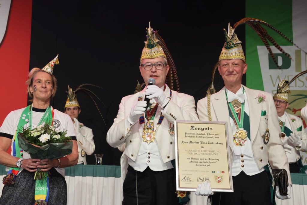 Normalerweise werden bei Sitzungen nie drei Redebeiträgen hintereinander platziert, aber auch das war beim Publikum der Weissfräcke möglich. Denn seit 2011 stellt sich jeweils eine Persönlichkeit der „Närrische Reifeprüfung“. In diesem Jahr die ehemalige Trainerin der Frauen-Fußballnationalmannschaft Martina Voss-Tecklenburg. Dem jeweiligen Prüfling ist es selber überlassen, wie er oder sie die Prüfung gestaltet. Oberbürgermeister Dr. Stephan Keller spielte Schlagzeug, NRW-Innenminister Herbert Reul kam in Uniform und schlug das Trömmelchen. Voss-Tecklenburg hatte sich für eine Reimrede entschieden, mit der sie besonders die Damen im Saal auf ihre Seite brachte, denn es ging um den Frauenfußball. Dabei kam auch zur Sprache, dass sich die Männer wehleidig immer lange auf dem Boden wälzen, während die Spielerinnen zügig weiterspielen. Auch sei die Erfolgsbilanz gemessen an Titeln bei den Damen deutlich besser, als bei den Herren. Mit ihrem Fazit „Frauen brauchen keine Eier, sie haben Pferdeschwänze“ war ihr der Applaus aller Gäste sicher und sie bestand mit summa cum laude.