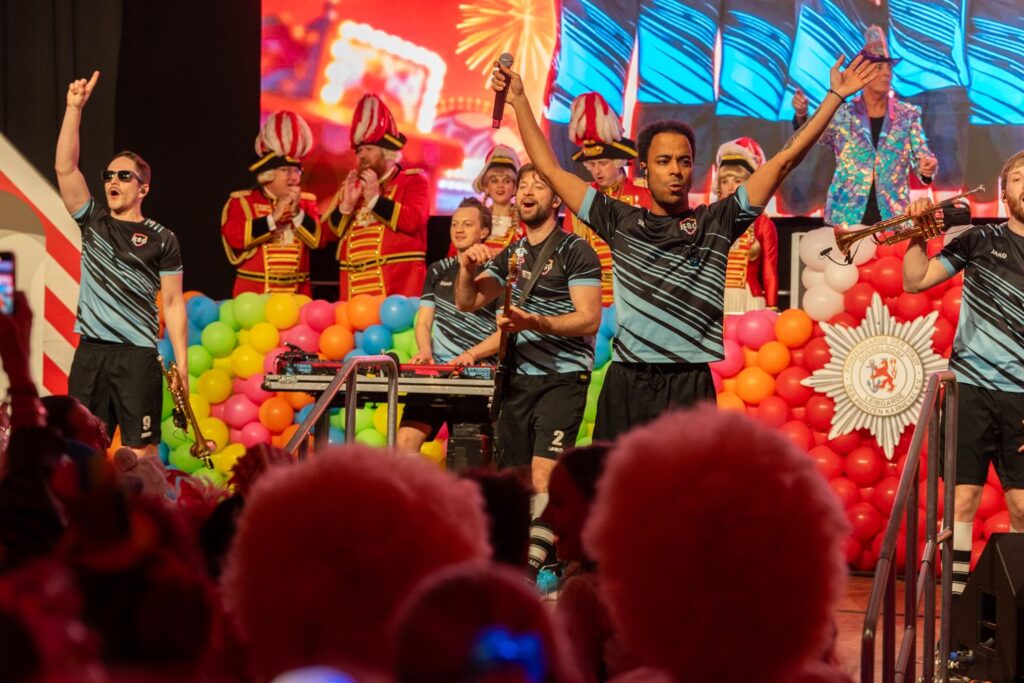Im ausverkauften Saal des Hilton feierten am Samstagabend (31.1.) rund 750 Gäste mit der Prinzengarde Düsseldorf unter dem Motto „Brauchtum verbindet – Die Prinzengarde feiert kunterbunt auf der größten Kirmes am Rhein“. Viele hatten ihre Kostüme dem Motto angepasst. So moderierte Präsident Dirk Kemmer als Düsseldorfer Spiegelpalast mit einer Jacke, die mit Spielstücken versehen war, und im Saal gab es zahlreiche Popcornverkäufer*innen, Autoscooter-Fahrer*innen, Boxer aus der Boxbude, Zuckerwatte bis hin zum Riesenrad.