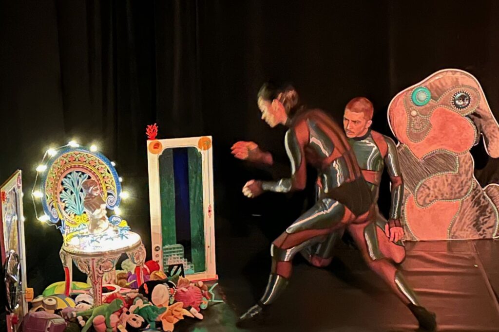 Am Anfang liegen die drei Tänzer*innen Ryan Drobner, Helena Gonçalves und Mattia Serio in der Ecke, verknotet wie die scheinbar niedlichen Kuscheltiere an einem der „Altäre“. Es ist ein Dröhnen in der Luft, das sich in der Komposition von Milan Julius Philipp später in dynamische E-Beats verwandeln wird. Aber die Bewegung beginnt ganz langsam. Ein Räkeln, ein Rollen. Ein Mädchen und zwei junge Männer kriechen hervor, recken und strecken die Glieder, richten sich schlangengleich auf, Hintern hoch, Kopf hoch. Rücken an Rücken stützen sie einander, bis sie endlich stolz und aufrecht tanzen.
