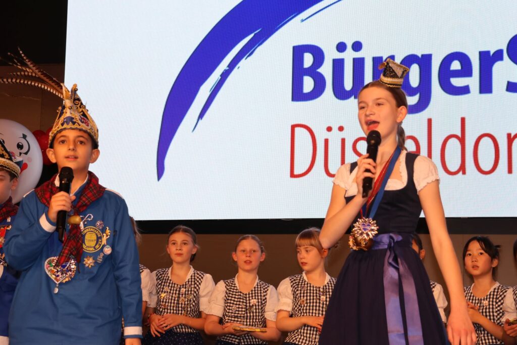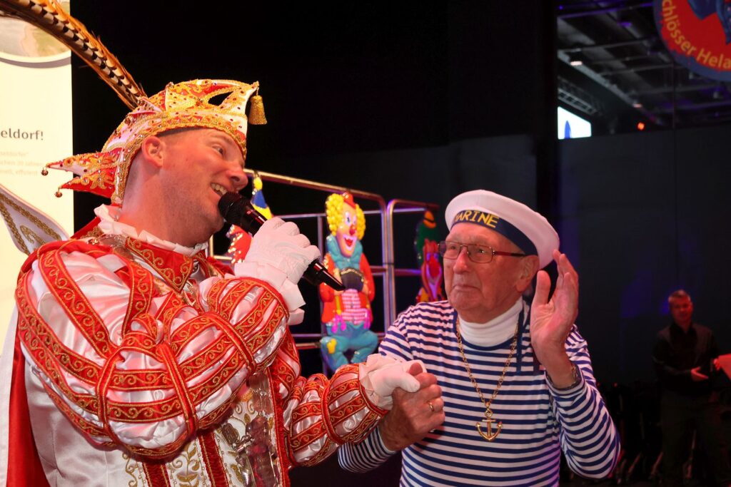 Das Prinzenpaar war nicht alleine gekommen, sie wurden von ihrer Adjutantur, dem Kindertonnenbauerpaar und der Kindertanzgarde aus Niederkassel begleitet. Prinz Marcus I. und Venetia Nicole lobten das Engagement der Bürgerstiftung: „Zeit investieren ist das Größte“, betonten die Tollitäten. Eine besondere Freude machte Prinz Marcus an diesem Nachmittag Wilhelm Körner. Der Senior, der gleich am ersten Tisch saß, erhielt persönliche Glückwünsche vom Prinzen zum 93. Geburtstag, den er gemeinsam mit vielen Jecken im Henkelsaal feierte.