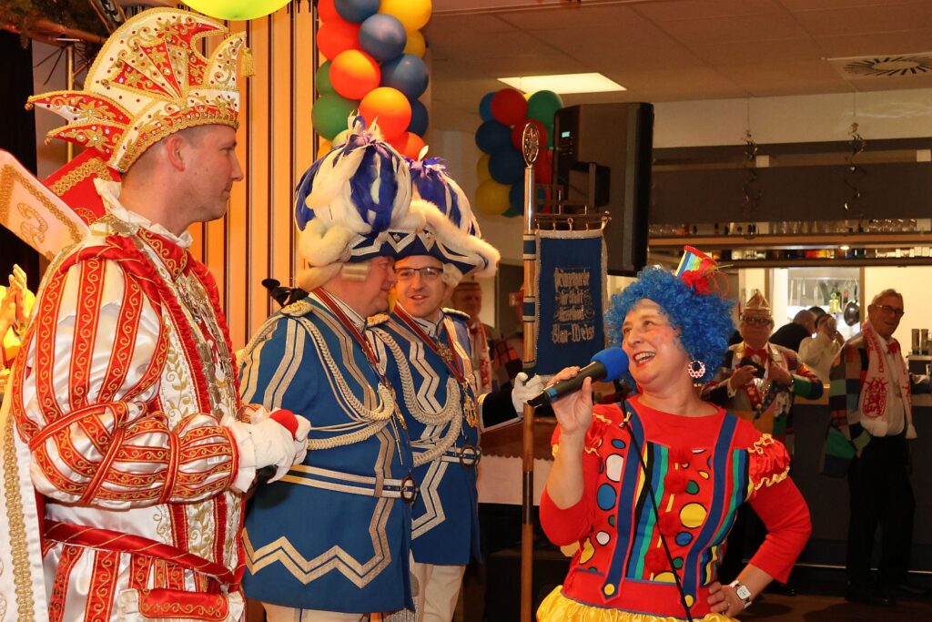 Mit ihrer blauen Perücke passte sie sogar zur Blau-Weissen Adjutantur. Beim „komm loss mer’ jet singe“ der Hoppediz-Wache hatte Susanne den Prinzen bereits erlebt und so war es für sie eine Ehre, wenigstens für einige Minuten die Frau an seiner Seite zu sein. Perfekt präsentierten beide das Sessionslied und auch die Ordensverleihung klappte reibungslos. Natürlich erhielt sie ebenfalls den Prinzenpaarorden und freute sich total. Prinz Marcus nahm noch eine Video-Botschaft vom ganzen Saal für die Venetia auf und dann ging es schon weiter im Programm.