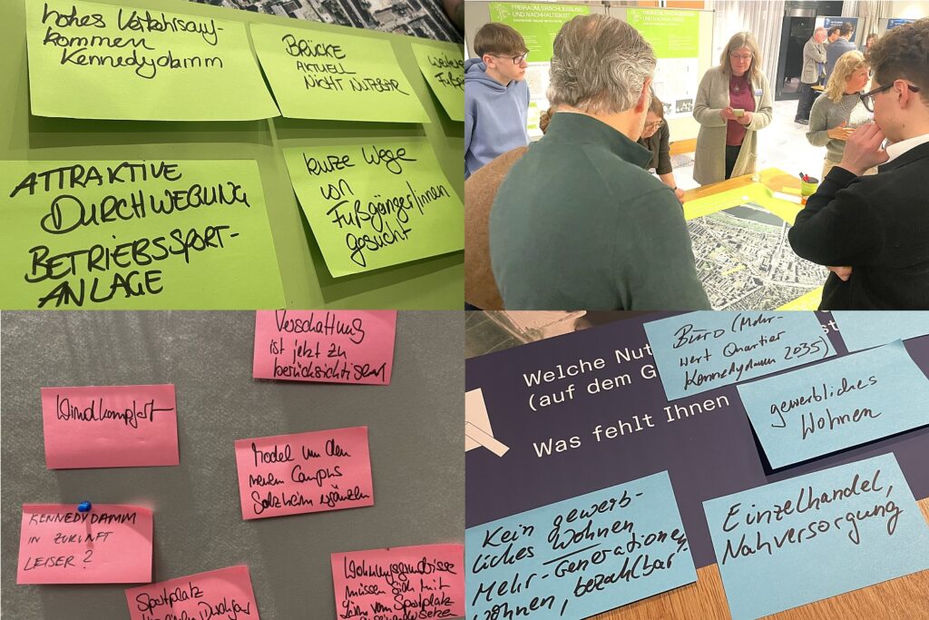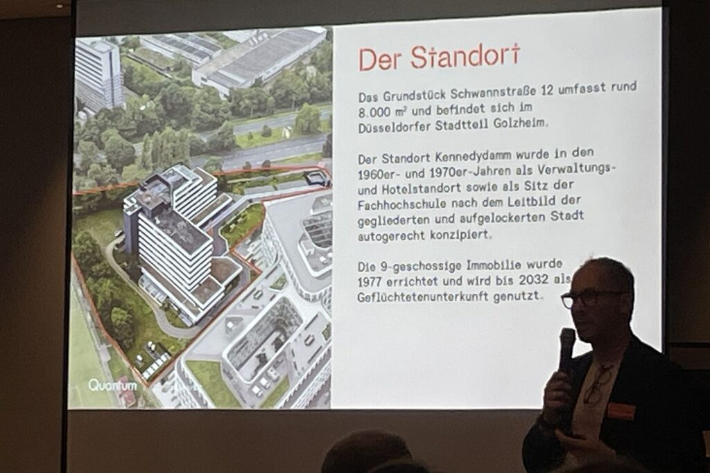 Dafür holten sich Quantum und das Architekturbüro CF Möller aus dem dänischen Aarhus Anregungen, Ideen, Wünsche von den Bürger*innen. Die legten verständlicherweise kein komplettes Nutzungskonzept für die künftige Schwannstraße 12 vor, hatten aber doch ganz individuelle Vorstellungen. Eine deutlich bessere Anbindung an die Stadtviertel auf der anderen Seite des Kennedy-Damms, wo der Campus Golzheim entstehen soll, wurde angemahnt. Außerdem wurde bezahlbarer Wohnraum gewünscht und der Einzelhandel- und die Nahversorgung solle gestärkt werden. Möglichst solle auf die Verschattung umliegender Gebäude verzichtet werden und den Verkehrslärm auf dem Kennedy-Damm eindämmen. Die maximale Bauhöhe dürfe 100 Meter nicht übersteigen. Bei einem hohen Gebäude müsse weniger Grundfläche versiegelt bleiben und im unteren Teil des Neubaus gäbe es Platz für die Öffentlichkeit, also für Nahversorger, Gastronomie und eine Markthalle. Es wurde auch um den Erhalt der Parkplätze gekämpft und eine Tiefgarage vorgeschlagen. „Man kann nicht alle Vorschläge berücksichtigen, aber es wird alles in die Planungen mit einbezogen“, versprach Fischer.