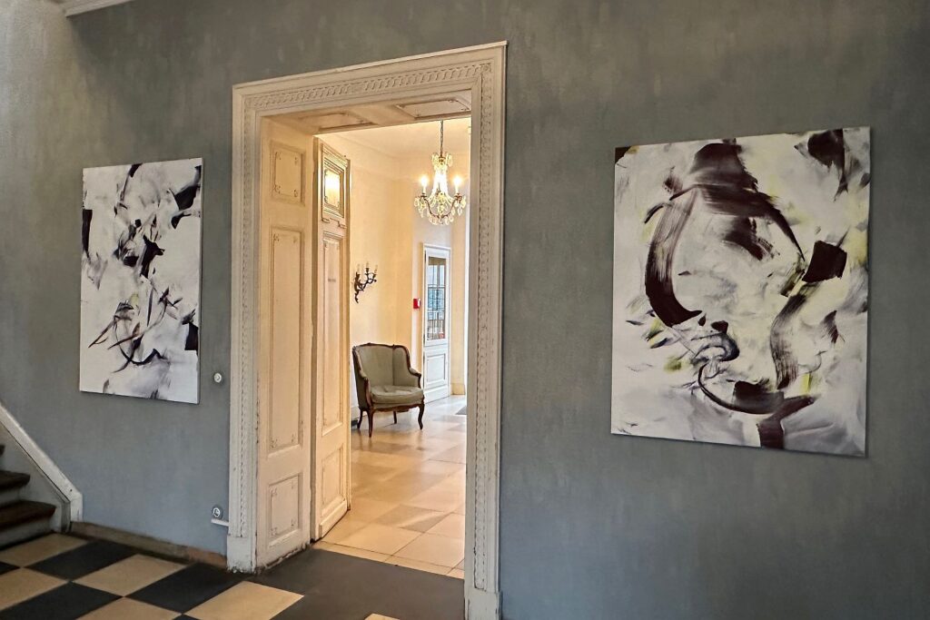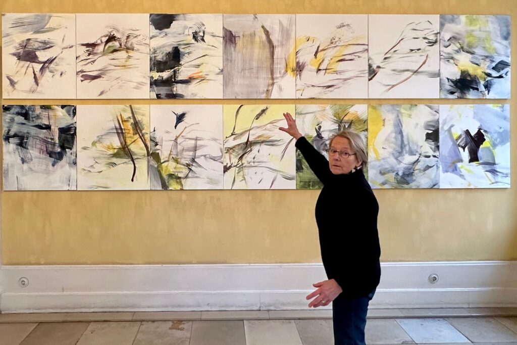 Die Sache mit dem Instrument ist nahezu wörtlich zu nehmen. Ein paar sehr zarte, schwebende Tuschzeichen zwischen den Fenstern des Historischen Hauses entstanden bei einer Malperformance zu Musik 2020 in Israel. Auch in der Düsseldorfer Tonhalle malte Brigitte Dümling schon live – zu Mussorskys „Bildern einer Ausstellung“. Eine Art Training ging voraus. Denn so leicht und spontan die malerischen Gesten auch wirken, sie werden von der Künstlerin streng komponiert, kontrolliert, eventuell ergänzt. Es kann schnell gehen oder ein halbes Jahr dauern, bis sie ein Werk als vollendet betrachtet.