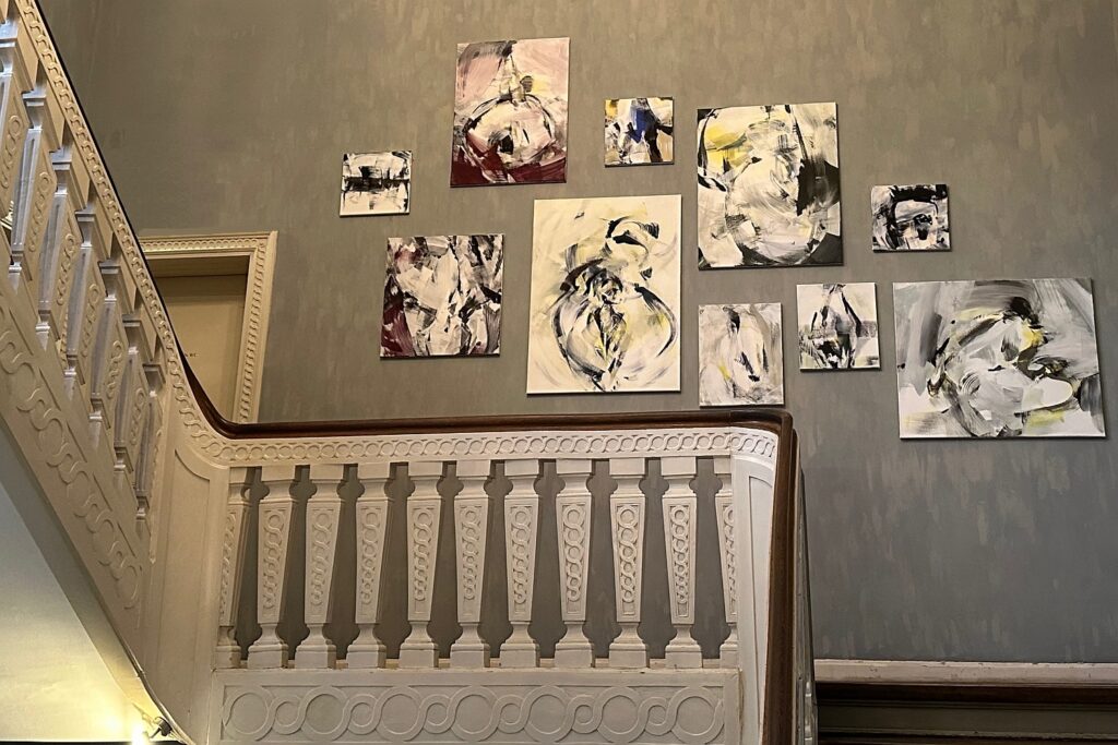 Nicht zu übersehen: die Kombination aus verschiedenen Formaten von Brigitte Dümling im Treppenhaus des Jacobi-Hauses. Foto: bikö