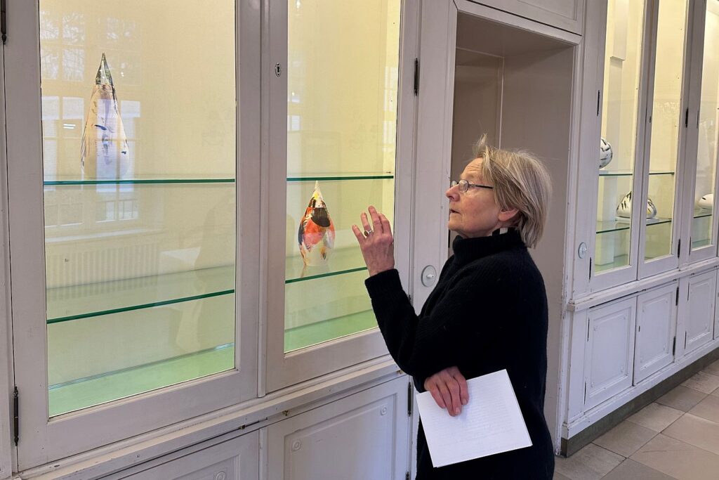 Das Zerbrechliche steht sicher in der Vitrine: Brigitte Dümling zeigt einige ihrer bemalten Keramiken. Foto: bikö
