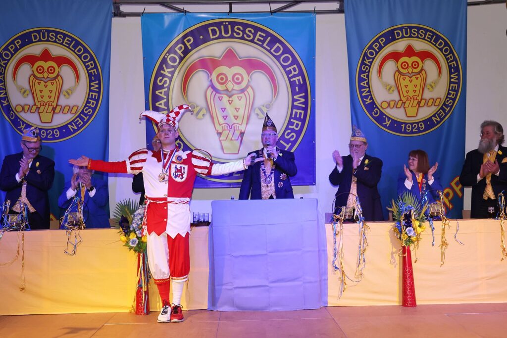 Den sollten sie haben, denn die Knaasköpp hatten ein buntes Programm zusammengestellt, bei dem für jede Altersstufe etwas dabei war. Den Auftakt machte die Prinzengarde der Stadt Ratingen Rot-Weiss und rot und weiss ging es auch weiter. Denn der neue Hoppeditz der Stadt Düsseldorf – und Mitglied der Knaasköpp – Jan-Philip Hilger, in seiner rot-weissen Narrenkluft erhielt viel Beifall für seinen Vortrag.