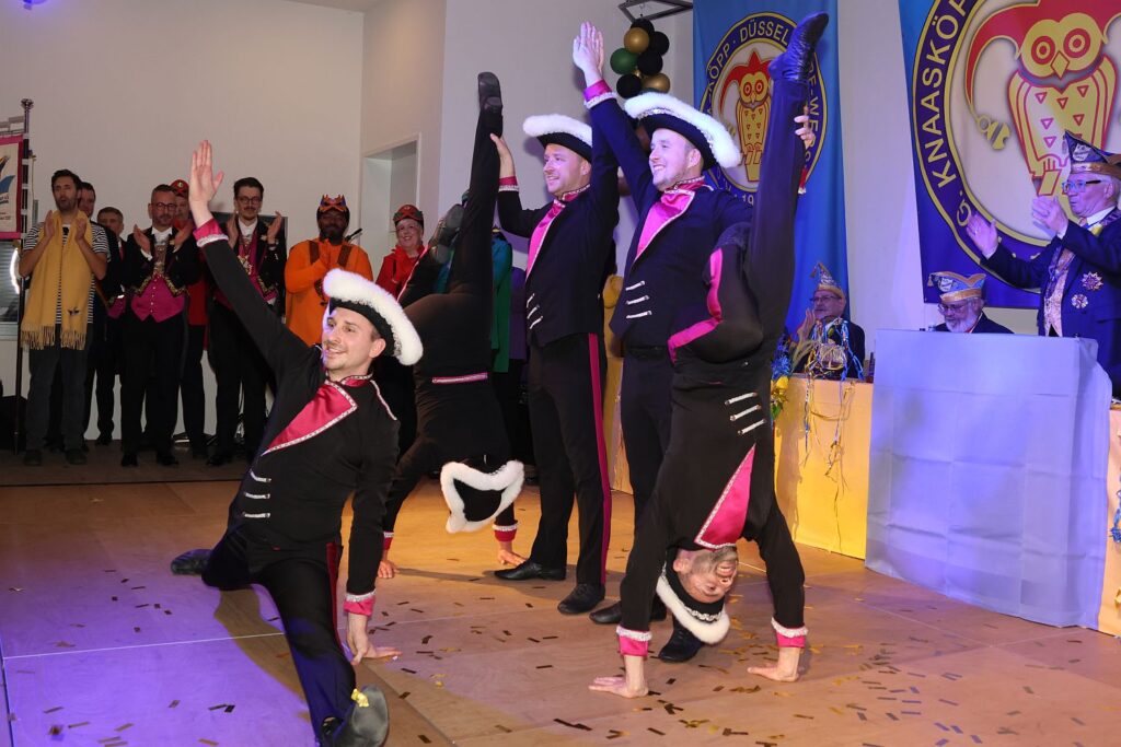 Bei Oli dem Köbes waren eher die Lachmuskeln strapaziert und dann ging es flott weiter mit den Hammern, den Tänzerinnen der Perlen vom Rosenkranz und Heinz Hülshoff, der alle Säle in Schwung bringt. Das Prinzenpaar Prinz Marcus I. und Venetia Nicole hatte am Samstag ein riesiges Programm zu absolvieren, aber sie nahmen sich die Zeit auch in Wersten bei den Knaasköpp vorbeizuschauen. Bevor DJ Frank Spehl mit seiner Musik für den Ausklang sorgte, wurde es mit den Karnevalsfreunden Bechen nochmal richtig voll auf der Bühne.