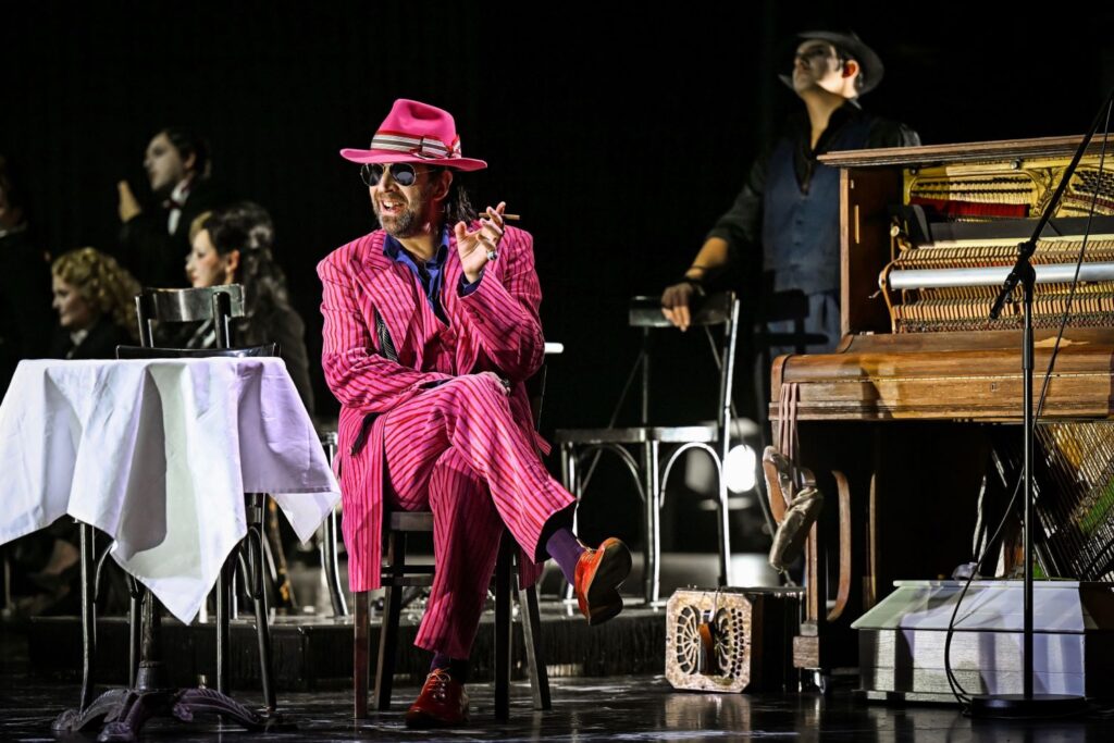 Es fängt an mit einem Flüstern und Beten: „Gegrüßet seist du, Maria …“, auf Spanisch. Doch unheilig ist die Szene: Gangstertypen, Frauen mit Strapsen, Ungewisses. Kellner schleichen mit Tabletts durch ein Nachtleben, das Bühnenbildnerin Katrin Connan üppig mit Neonlichtern und Bistro-Möbeln dekoriert hat. Vorne wird eine rothaarige Puppe aus einem Kindersarg gehoben. Denn die fatale Frau, um die es hier geht, stirbt und will doch erneut leben: María de Buenos Aires. Ein Geist im pinken Anzug, El Duende (Alejandro Guyot), erzählt von ihr, „jetzt, da sie in der kläglichen rebellischen Verstimmung eines raffiniert vorgetäuschten Klaviers Tango spielen mit deinen Knochen.“