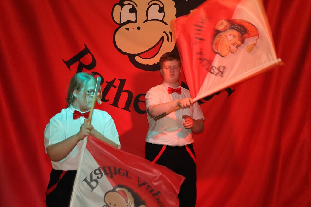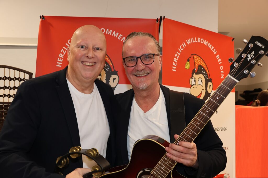 Die Aape United überzeugten mit ihrem Garde- und ihrem Showtanz. Die Tänzerinnen haben mittlerweile männliche Verstärkung bekommen, sich sich bestens in die Choerographie einfügten. Nachdem Dominik und Lea trotz der niedrigen Deckenhöhe ihre Fahnenschwenkkünste vorgeführt hatten, übernahm Et Zweijestirn in Person von Roland Jansen und Carsten Forg.
