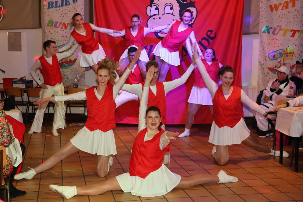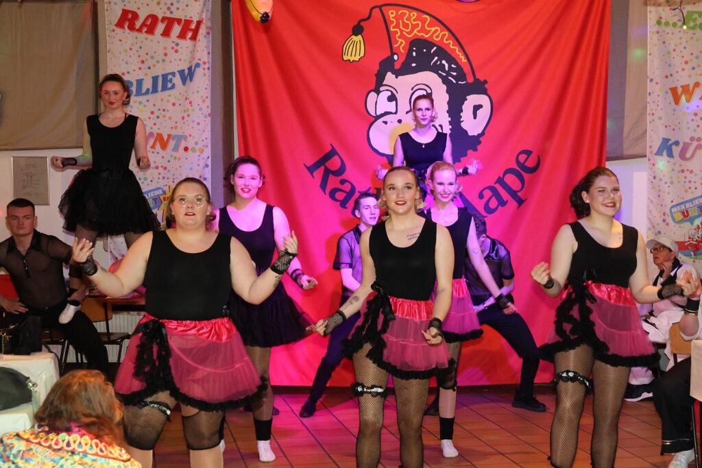 Für beste musikalische Unterhaltung sorgten Heinz Hülshoff und die Band Die Anderen, die flotte Gruppierung des Fanfarencorps Oberbilk. Nachdem das Aape Männerballett die Mädels zum jubeln gebracht hatten, ging der Abend fließend in die Karnevalsparty für alle über, bei der DJ Stefan und Max Weyers einheizte.