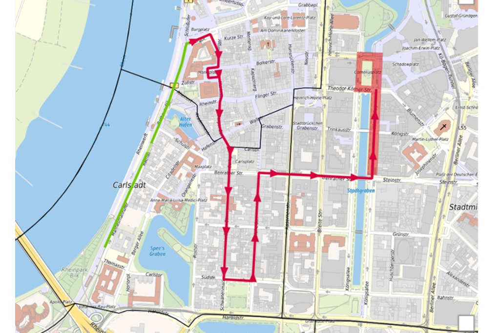 Die Zugstrecke des Kinder- und Jugenumzugs 2026, Grafi: openstreetmap, https://maps.duesseldorf.de/
