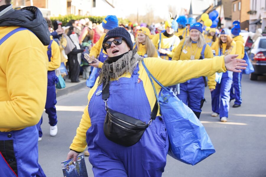 Der Eigenname eines schwedischen Möbelhauses ergibt den Narrenruf von Düsseldorf Unterbach: IA! Daraus hatte diese Truppe ihre Kostümidee in Schwedenfarben gemacht.