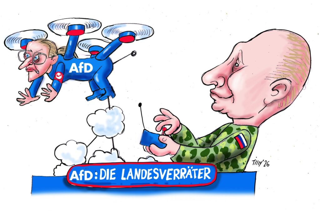 Und dann wäre da noch die AfD: Tilly lässt Putin mit einer Alice-Weigel-Drohne spielen und stellt die Partei als Landesverräter hin.