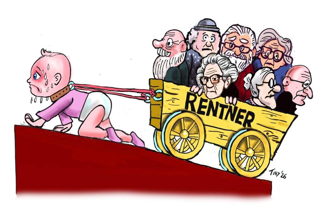 Ein krabbelndes Baby soll einen Karren voller Rentner ziehen – die Renten sind sicher?