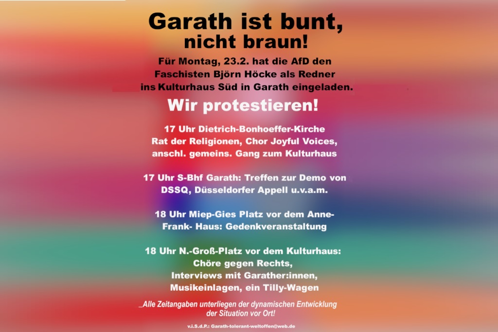 Die Garather Bürger*innen und viele Menschen aus Düsseldorf und Umgebung setzen alles daran, den Stadtteil am Montagabend als Hochburg des Gegenprotest zu zeigen. Keine Veranstaltung der AfD in Düsseldorf verlief bisher ohne Gegenprotest. Höcke darf gerichtlich bestätigt als Faschist bezeichnet werden und wurde rechtskräftig wegen der Nutzung verbotener Losungen der NSDAP verurteilt. Dass ausgerechnet er nach Garath kommt, hat viele Gruppierung aktiviert.