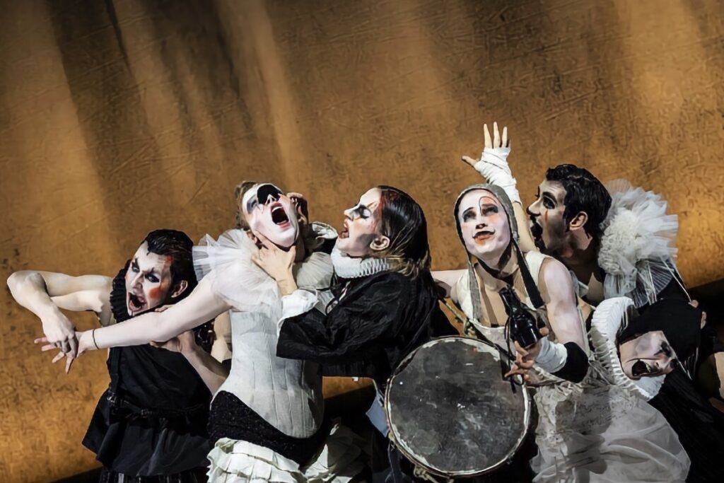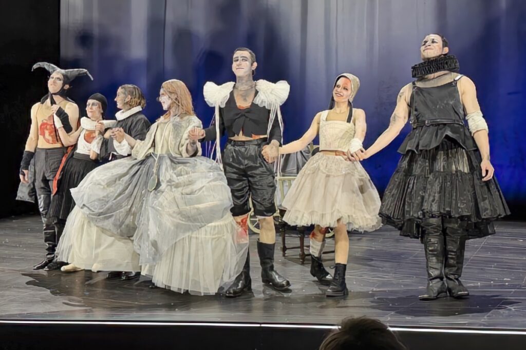 Wilde Truppe (von links): Die Schauspielstudent*innen Vincent Wiemer, Flavia Berner, Ludowika Held, Anastasia Schöpa, Jonas Hanke, Alisa Lien Hrudnik als Gaukler. Foto: Sandra Then / Schauspiel Düsseldorf