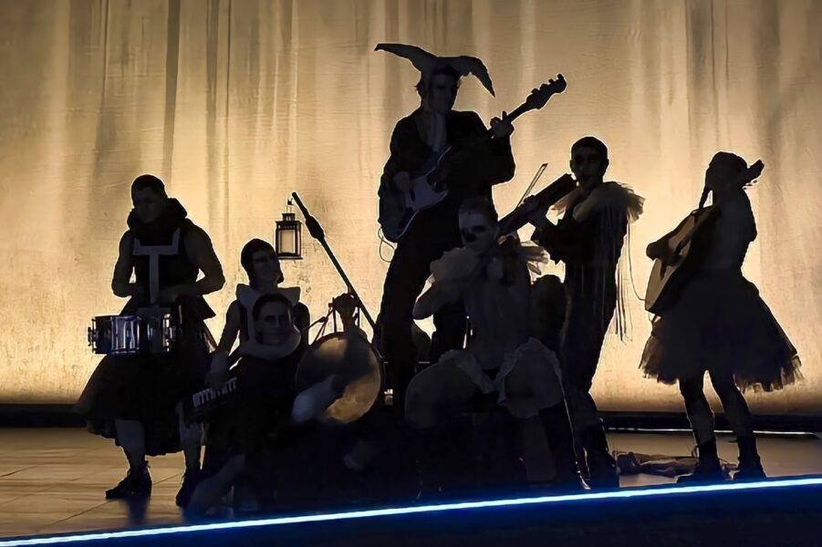 • Die Gaukler sind da: Vor Beginn der Vorstellung macht Tylls Truppe furiose Musik. Ein Schattenspiel auf der Bühne. Foto: bikö