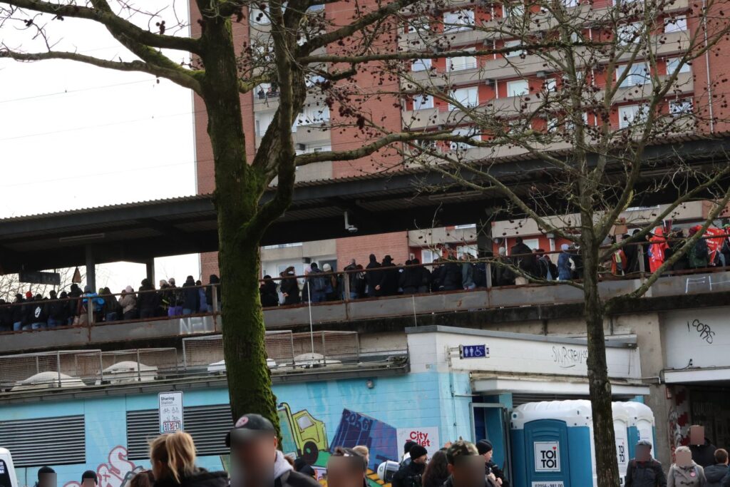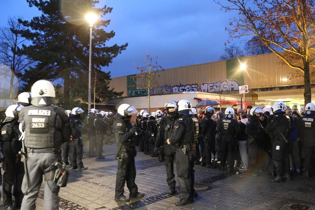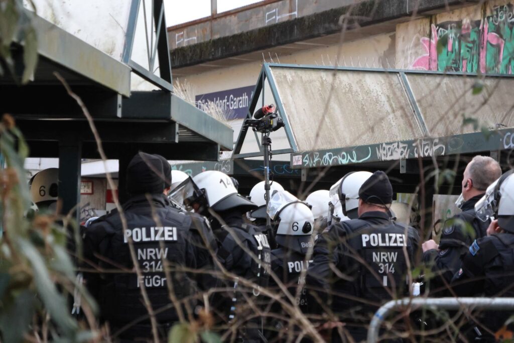 Während die rund 300 AfD-Anhänger*innen vor dem Kulturhaus Süd im Regen auf die Ankunft von Björn Höcke warteten, zog der von Düsseldorf stellt sich quer (DSSQ) Demonstrationszug von der West-Seite des Garather S-Bahnhofs über die Koblenzer Straße zur Frankfurter Straße. Dabei war die Anreise für alle durchaus schwierig gewesen. Die Polizei hatte bereits im Vorfeld umfangreiche Straßensperrungen angekündigt und so waren vielen mit der S-Bahn gekommen. Das führte zu absolut überfüllten Bahnen und auch die Unterführung am S-Bahnhof erwies sich als Nadelöhr. Da die Polizei den Bereich zeitweise komplett abriegelte, um Demonstrierende zu separieren, kam es zu Gedränge und Enge – zumal auch Tränengas eingesetzt wurde.