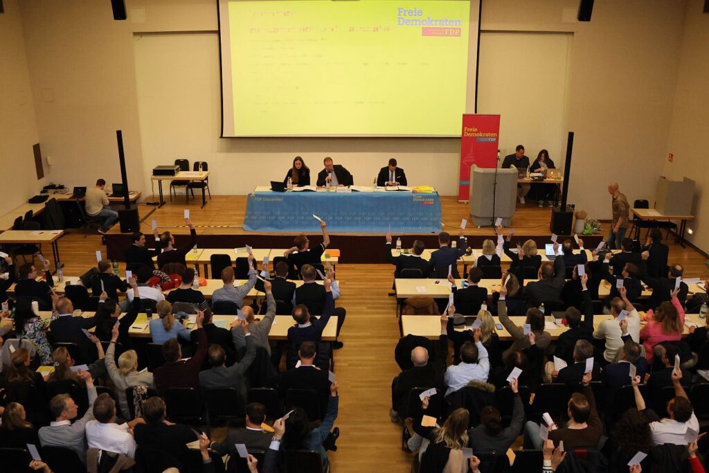 Mit Spannung erwarteten rund 230 Mitglieder der FDP am Samstag (14.3.) den Ausgang der Wahl zum neuen Kreisvorsitzenden. Denn Moritz Kracht hatte bereits Ende Dezember 2025 mitgeteilt, nicht mehr für das Amt kandidieren zu wollen. Dass die beiden Kandidaten Dr. Ulf Mainzer und Mirko Rohloff jeweils über eine große Anhängerschaft unter den knapp 1000 Mitgliedern des Kreisverbandes verfügten, zeigte die außergewöhnlich hohe Resonanz beim Kreisparteitag, denn im Townhaus an der Bilker Straße reichten die Stühle kaum aus.