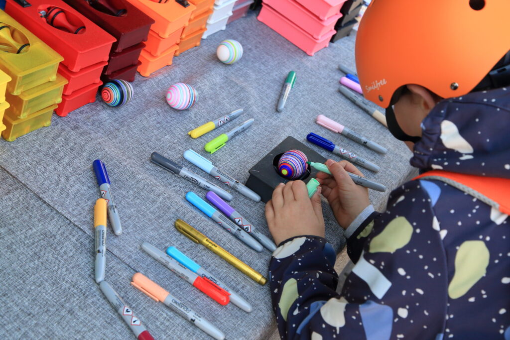 Dazu gab es am Stand der Familie Urban auch eine besondere Eier-Malmaschine. Das Ei wurde eingespannt und ein kleiner Motor sorgte dafür, dass sich das Eier drehte. Nun musste man nur noch einen Stift dranhalten und schon entstanden Eier in tollem Ringel-Look.