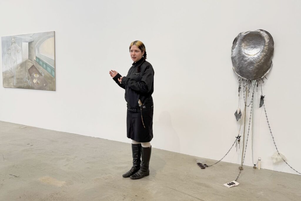 Rundherum geht es dezenter zu, aber auch schön skurril. Sonja Heim hat Strichmännchen und andere Skizzen an die Wand gepinnt, mit Bleistiftrahmen versehen und hier und da mit ein paar Glitzersteinen geschmückt. Ihr „Point of View“ (Standpunkt) der zart-verspielten Art. Zoé Cathérine García feiert auf einem Bild mit durchsichtigen Gestalten ein „milk feast“ (Milchfest) und schuf aus Metall ein Objekt, das an eine Chatelaine erinnert, einen viktorianischen Gürtelschmuck zum Befestigen von nützlichen Dingen. „I remember the weight on the hip“ nennt sie das, ich spüre das Gewicht an den Hüften.