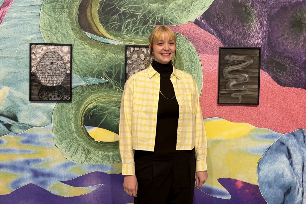 Malerin und Bildhauerin: Zoé Cathérine García zwischen ihrem Bild „milk feast“ und einem Wandobjekt. Foto: bikö