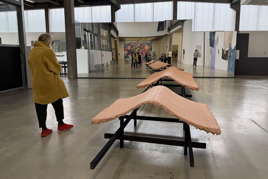 Ganz leicht sind hingegen die Wandbehänge von Ruben Benjamin Smulczynski, der durchsichtige Stoffe, Pfauenfedern und glitzernde Collagen zusammenstellt und mit poetischen Titeln versieht wie: „Goldfäden mit den Zähnen durchbeißen“.