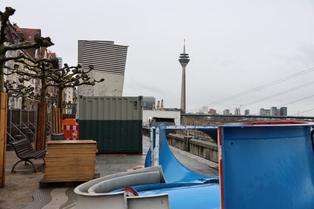 Die Baustelleneinrichtung soll bis zum Start des Düsseldorfer Marathons am Sonntag, 26. April, weitgehend zurückgebaut werden, um Einschränkungen im Bereich der Rheinuferpromenade möglichst gering zu halten.