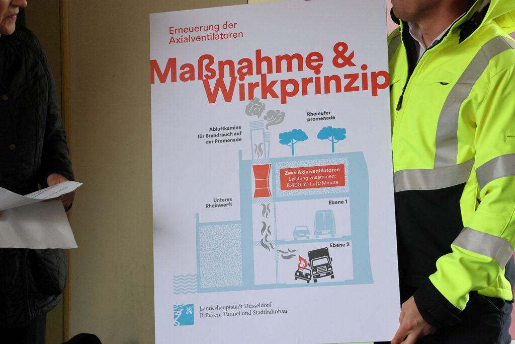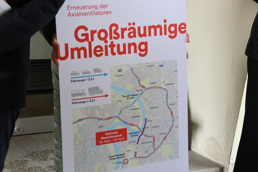 Grund für die lange Sperrung ist der Einbau neuer Ventilatoren, die im Brandfall den Rauch ableiten sollen. Die Ventilatoren sind von zentraler Bedeutung für das Brandschutzkonzept und damit unverzichtbar für den Betrieb des Tunnels, teilt die Stadt mit. Bereits seit Anfang März wurde am Rheinufer im Bereich der Alten Hafens die Baustelle für die Maßnahme eingerichtet. Der Terminplan ist eng, denn am 27. April startet der Uniper Marathon – dann wird diese Fläche gebraucht – also muss dann alles fertig sein.