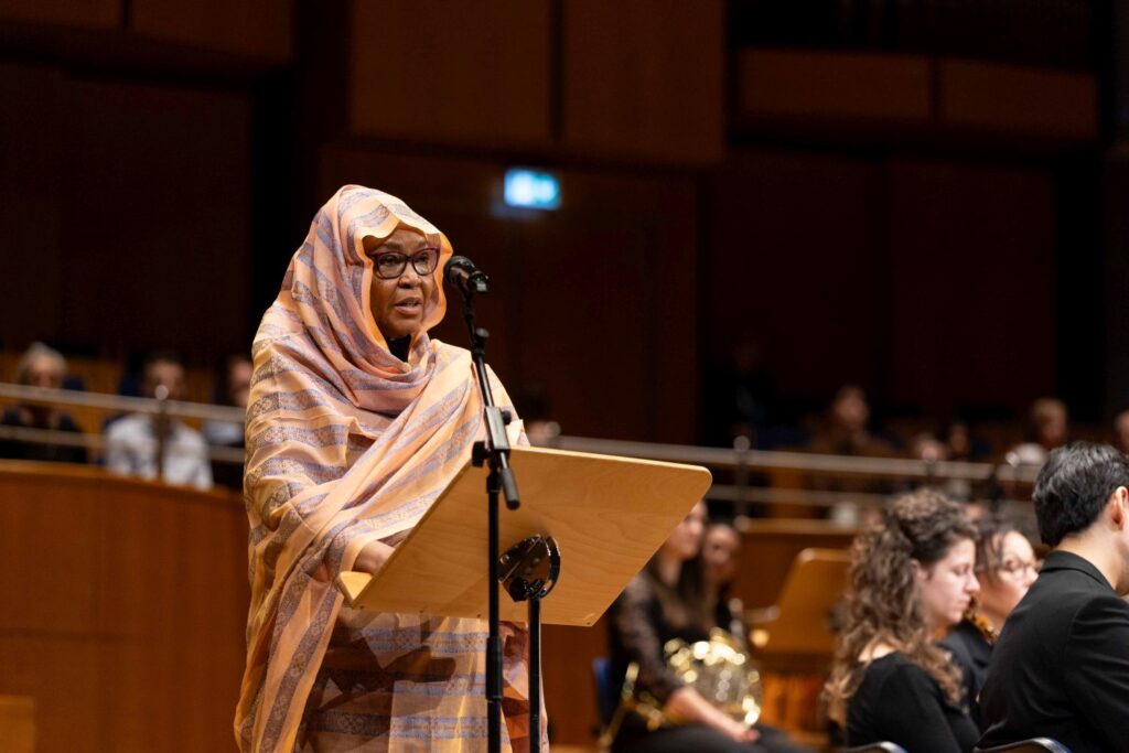 Der Mendelssohn-Saal der Tonhalle war voll besetzt, als Adam Fischer ausführte, warum die Wahl auf Salwa Elsadik gefallen war. „Der russische Angriffskrieg auf die Ukraine und die fürchterliche Eskalation im Nahen Osten dominieren die Schlagzeilen. Vom Sudan spricht niemand,“ erklärte er. Denn bereits seit drei Jahren herrscht im Sudan ein Bürgerkrieg, den die Vereinten Nationen als die derzeit größte humanitäre Katastrophe weltweit bezeichnen. Die Preisträgerin Salwa Elsadik gründete die „Women Advocacy and Development Initiative“(WADI), die sich für Frauen und Mädchen im Sudan einsetzt und an vorderster Front humanitäre Hilfe leistet. Trotz Gewalt und politischer Instabilität kämpft Elsadik unermüdlich für Frieden, Gleichberechtigung und Menschenrechte.