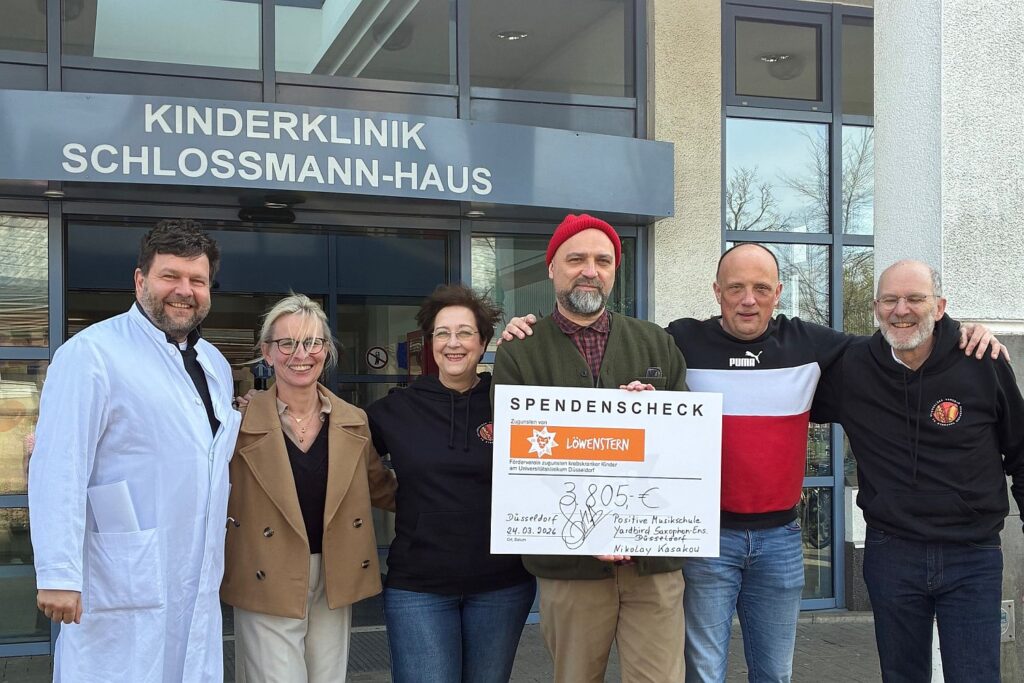 Aktualisierung: Die Mitglieder des Yardbird Saxophon-Ensembles der Positiven Musikschule Düsseldorf übergaben am 24. März 2026 zusammen mit ihrem Leiter Nikolay Kasakov deb Spendenscheck in Höhe von 3.805 Euro an Löwenstern e.V., den Förderverein zugunsten krebskranker Kinder am Universitätsklinikum Düsseldorf.