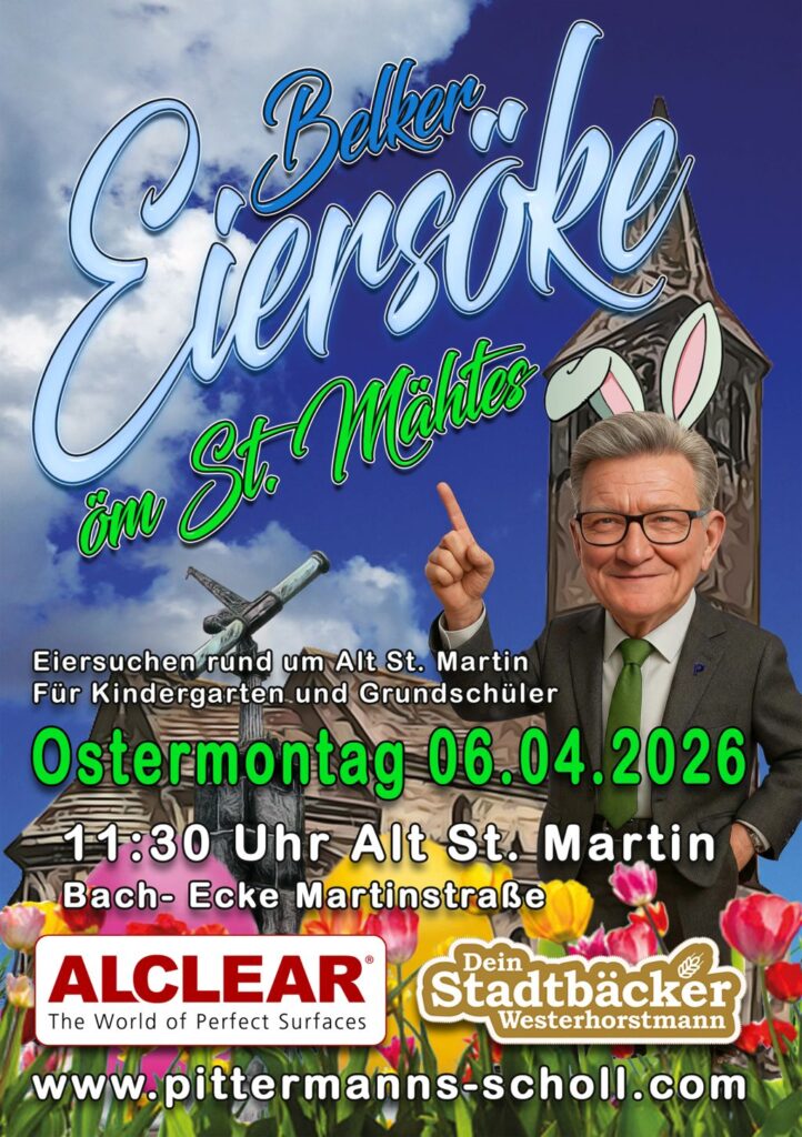 „Belker Eiersöke öm St. Mähtes“ heißt es in der Einladung der Pittermanns Scholl an die Kinder der Kitas und Grundschulen am Ostermontag (6.4.). Um 11:30 Uhr rund um Alt St. Martin an der Ecke Bachstraße und Martinstraße wird der Bilker Osterhase erwartet. Das Fest ist für die ganze Familie organisiert und viele spannende Aktivitäten sind vorbereitet. Die Aktion ist kostenlos und eine Anmeldung nicht erforderlich.