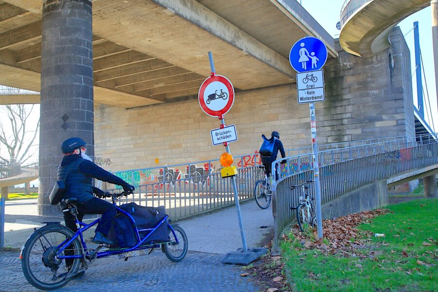 Ohne jede Vorwarnung hat die Stadtverwaltung Düsseldorf Fakten geschaffen und die Theodor-Heuß-Brücke für Lastenräder gesperrt. „Wir sind sprachlos“, sagt Daniela Günther, Vorsitzende des ADFC Düsseldorf. „Wir trauten heute Morgen unseren Augen kaum, als wir die ersten Meldungen aus dem Düsseldorfer Norden erhielten.“ An den Zufahrten stehen bereits brandneue Verbotsschilder, die keinen Zweifel an der neuen Härte der Verkehrsverwaltung lassen. Während der motorisierte Individualverkehr weiterhin über den Rhein rollt, wird das umweltfreundlichste Transportmittel der Stadt einfach ausgebremst, kritisiert der Düsseldorfer Fahrradclub.