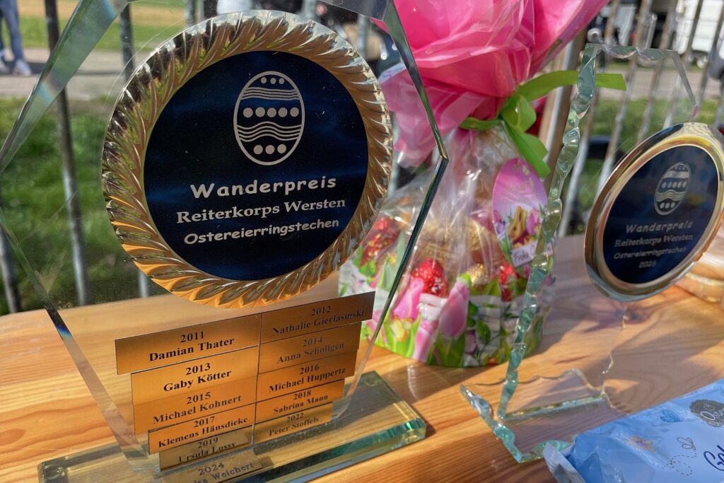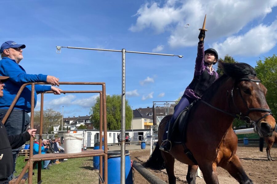 Wo am Ostersamstag noch das Osterfeuer loderte und die Westener fröhlich feierten, drehten am Ostermontag (6.4.) ganz entspannt Pferde ein paar Runden. Denn der Platz an der Opladener Straße war Austragungsort für das Ostereier-Ringstechen des Reiterkorps des St. Sebastianus Schützenvereins Wersten. Traditionell wird kein Startgeld erhoben, sondern die Reiter*innen bringen Oster-Leckereien mit, die zum Schluss bei der Siegerehrung verteilt werden.