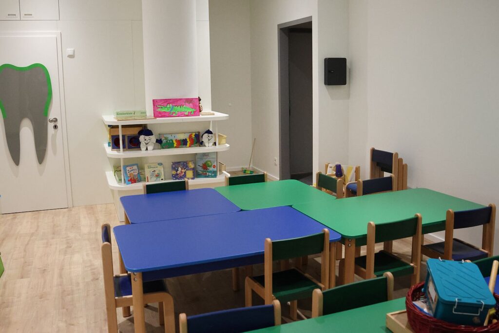 Gleich daneben befinden sich die Räumlichkeiten des Mundhygienezentrums, das die AOK in Kooperation mit der Stadt und dem Gesundheitsamt betreibt. Hier steht die kindgerechte Vermittlung von Zahnpflege im Mittelpunkt. Ein besonderes Highlight ist der „Kariestunnel“, in dem Kinder spielerisch lernen, wie sie ihre Zahngesundheit selbst stärken können. Nachdem sie sich die Zähne mit einem speziellen Liquid geputzt haben, können sie selber bei Schwarzlicht erkennen, ob das ausreichen gut war. Mit dem Maskottchen, dem Krokodil Fred, lernen sie viel über gesunde Ernährung.