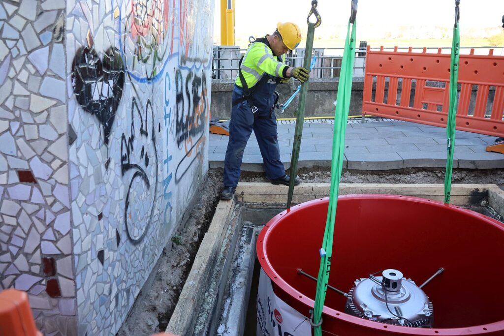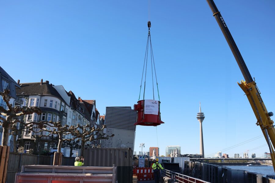 Aber alles jammern hilft nicht, denn die Arbeiten im Tunnel sind alternativlos. Seit der Eröffnung des Rheinufertunnels 1993 wurden zwar Wartungen und Instandsetzungen regelmäßig durchgeführt, doch neue Vorschriften verlangen nun einen Austausch der Axialventilatoren, die im Brandfall den Tunnel entlüften. Beim Bau des Tunnels war noch eine Brandlast von 250 Grad ausreichend, mittlerweile sind 400 Grad für den sicheren Betrieb vorgeschrieben. Nachdem die beiden fünf Meter hohen Ventilatoren mit der damit zusammenhängenden Technik in den vergangenen Tagen auseinandergenommen und aus den Tunnel entfernt wurden, können seit Mittwoch (8.4.) ersten Einzelteile der neuen Axialventilatoren mithilfe eines Krans durch nur zweieinhalb mal zwei Meter große Luke in den Tunnel eingebracht werden. Dort werden sie in einem schmalen Schacht montiert.