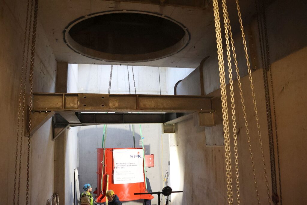 Allein dieses Teil mit dem Motor des neuen Axialventilator wiegt 2,8 Tonnen und wird vorsichtig durch den schmalen Schacht nach unten gebracht