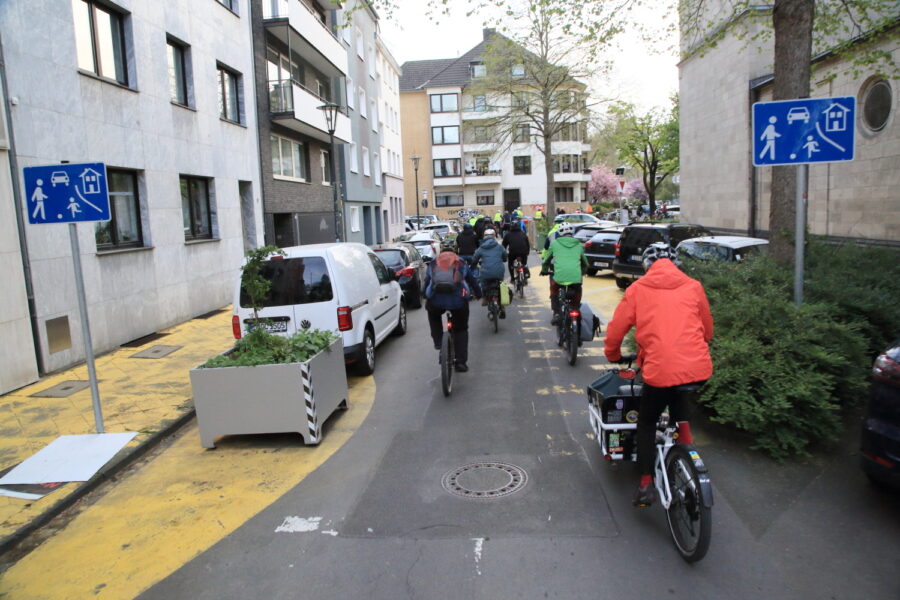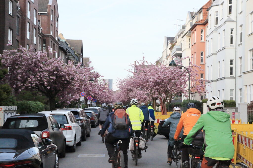 Diesmal ging die Runde am Rhein entlang zu Kirschblüte auf der Zietenstraße und von mit einer Schleife über den Paulusplatz – ein eher schlechtes Beispiel dafür, wie die Stadt Verkehrsplanung betreibt. Über den Lastring in Richtung Handwerkskammer fuhren die Radler*innen über die Lorettostraße und Reichsgasse zurück zum Fürstenplatz. Die Gruppe wurde während ihrer Ausfahrt freundlich von Fußgänger*innen und anderen Radfahrer*innen gegrüßt, während die Autofahrer*innen ihnen eher aggressiv begegneten und versuchten, an unmöglichen Stellen zu überholen.