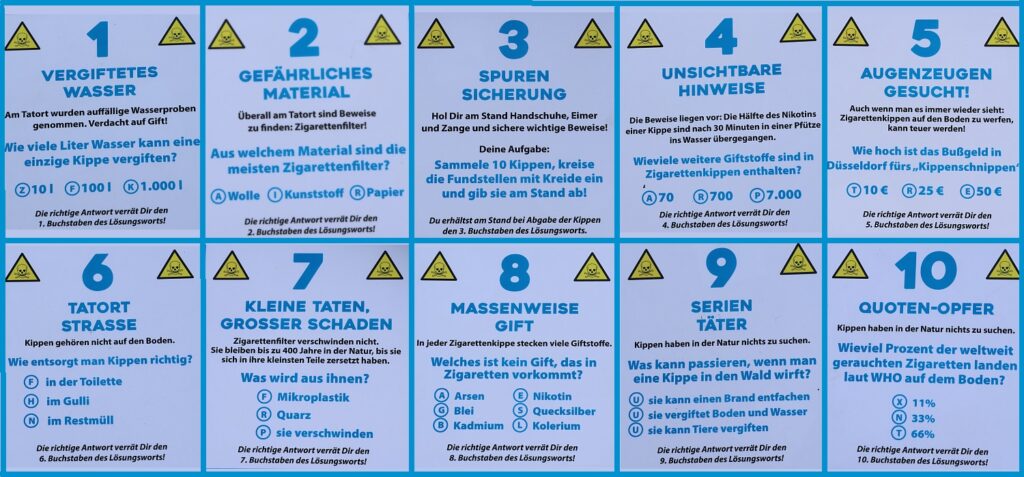 Dies war das Szenario, dass das Team von Blockblocks CleanUp am Samstag (11.4.) errichtet hatte und damit versuchte die Menschen zu motivieren, mehr über Kippen und ihre Folgen herauszufinden. Denn jeder der wollte, konnte Detektiv spielen und sich auf Spurensuche begeben. An zehn Stationen, jeweils markiert durch eine XXL-Zigarette, galt es Fragen zu beantworten. Die richtigen Lösungen ergaben das Lösungswort – hier kann mitgeraten werden:
