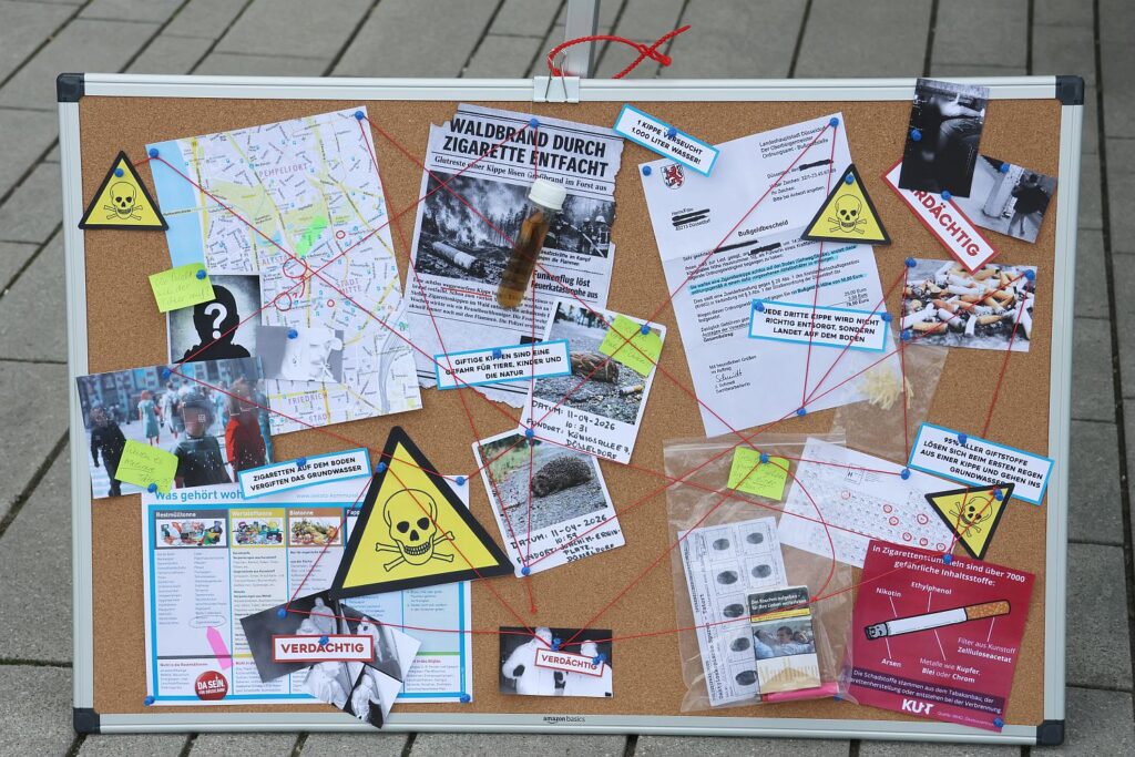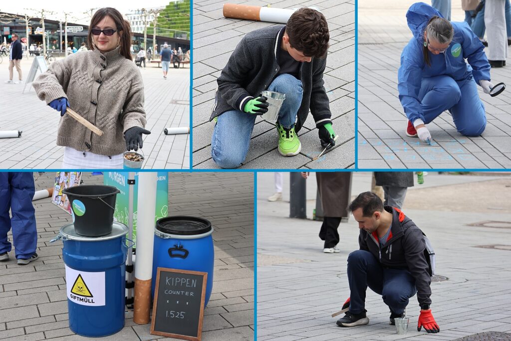 Alles, was man für das Detektivspiel und den damit verbundenen Cleanup brauchte (Handschuhe, Greifer, Eimer und Müllsäcke) gab es vor Ort. Bei bestem Wetter ließen sich zahlreiche Passanten motivieren mitzumachen. Sensationelle 12.900 Zigarettenkippen wurden zwischen 12 und 16 Uhr gesammelt – und das nur in der Umgebung des Joachim-Erwins-Platzes!