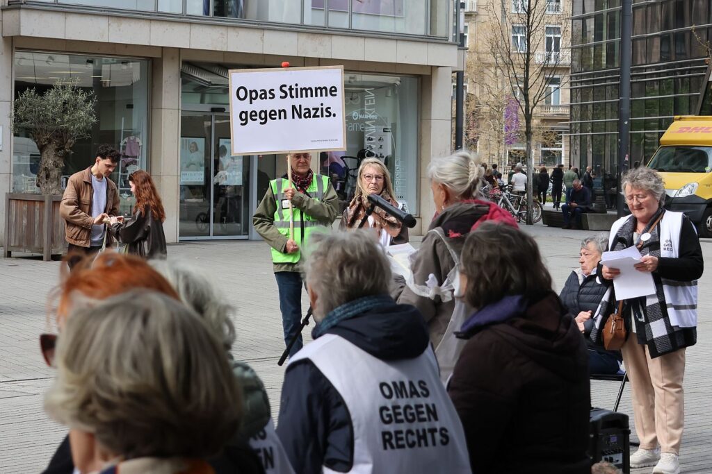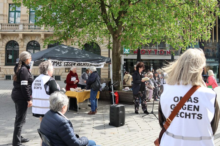 Das kam längst nicht bei allen Menschen gut an. So gab es unter der Ankündigung der Veranstaltung auf Facebook einen regelrechten Shitstorm von Menschen rechter Gesinnung, die die “Omas” wüst beschimpften und verunglimpften. Und auch am Samstag gab es Gegenwind. Ein Herr, der sich als CDU-Mitglied bezeichnete, echauffierte sich. Er fühle sich allein durch die Begrifflichkeit „Omas gegen Rechts“ angegriffen. Es müsse „Omas gegen Extremismus“ heißen, denn Linke seien ebenso schlimm. Auf die Frage, ob er sich denn gegen rechte Bestrebungen engagiere, beispielsweise mit der Teilnahme an der PRÜF-Demo, die ab 14 Uhr vor dem Landtag stattfand, erwiderte er nichts. Die Omas gegen Rechts packten um 13 Uhr ihren Stand zusammen und zogen weiter zur Landtagswiese, denn seit dem Start der PRÜF-Demos sind sie dort dabei.