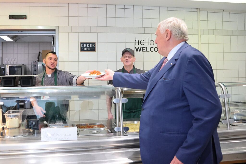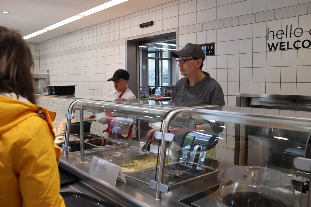 Agata Reul zeigt sich begeistert über die Motivation des Teams von sieben Personen, die in der Küche vorbereiten und dann auch das Essen ausgeben. Alles wird mit guten Zutaten frisch gekocht und angerichtet. Patrick, einer der Teilnehmer, freut sich über die neue Aufgabe. Agata Reul und Dennis Nikolay haben auch ein offenes Ohr für Probleme und wenn eine Aufgabe nicht klappt, gibt es eben eine andere, berichtet er. Aktuell ist die Kantine dienstags und donnerstags in Betrieb. Mittwochs ist das Team aber auch vor Ort und bereitet schon mal vor.