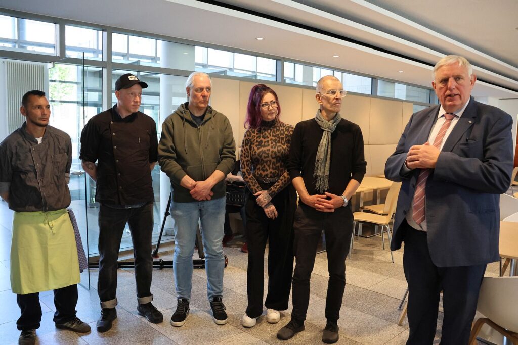 Die Beschäftigten des MAGS sind sehr angetan vom Essen und der Freundlichkeit des Personals. Die ehemals verwaiste Kantine ist wieder ein Treffpunkt und bei schönem Wetter kann auch die Terrasse genutzt werden. Minister Karl Josef Laumann machte sich am Dienstag (14.4.) selber ein Bild vom Projekt. Für das Team hatte er als Geschenk einen Satz Schürzen mitgebracht. Von seinen Mitarbeitenden hatte er schon viel Lob zum Projekt gehört, bisher war er noch nicht dazu gekommen das leckere Essen selber zu probieren.